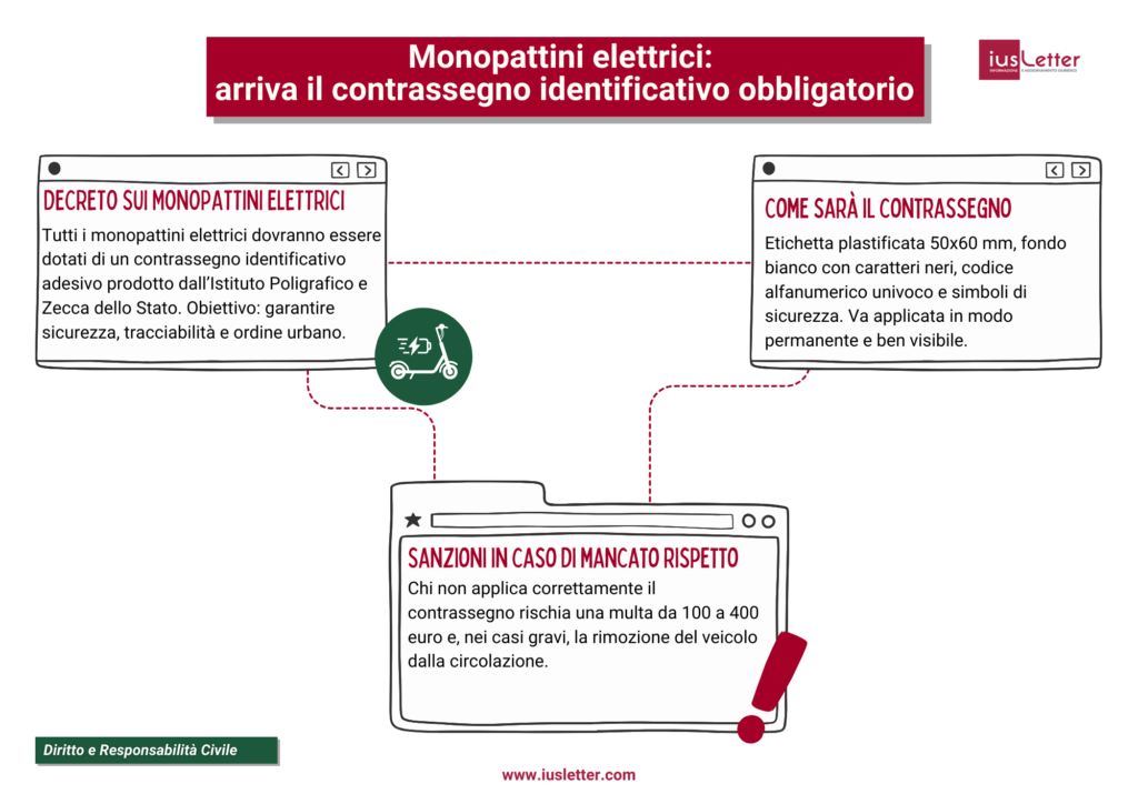 Con il Decreto del Ministero delle Infrastrutture e dei Trasporti 27.6.2025 n. 210, attuativo dell’articolo 1, comma 75-vicies quater, della legge 27 dicembre 2019, n. 160, come modificato dalla legge 25 novembre 2024, n. 177, viene stabilito l’obbligo, per tutti i proprietari di monopattini elettrici, di dotarsi di un contrassegno identificativo adesivo pensato per rendere ogni veicolo riconoscibile in modo semplice e immediato.
